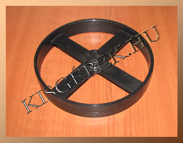 Átmérője 173 mm, magassága 27,5 mm. Furat lapolt. Műanyag.